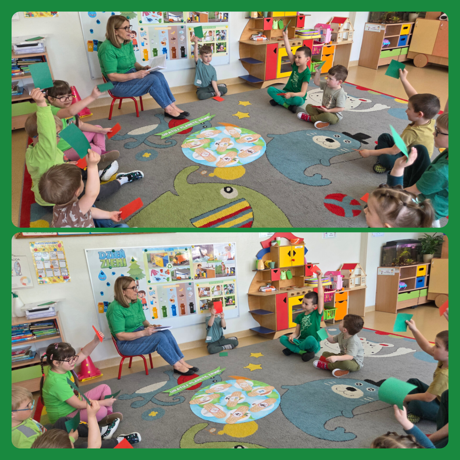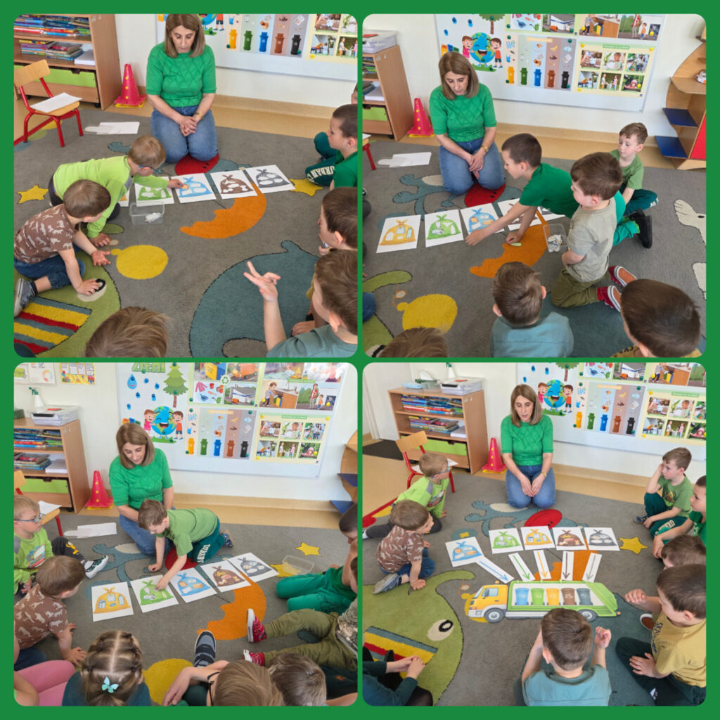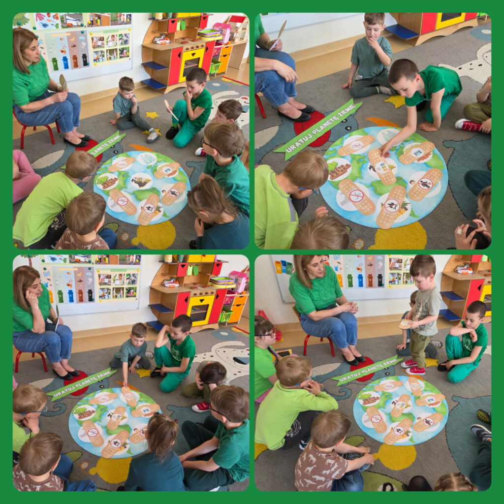 W ramach zajęć dzieci brały udział w grach, zabawach i konkursach; poznawały ciekawostki ekologiczne oraz wykonywały prace plastyczno- techniczne. Na zakończenie przedszkolaki z ogromnym zaangażowaniem przystąpiły do posprzątania terenu wokół przedszkola. Porządkując wyznaczony teren miały poczucie, że robią coś ważnego dla naszej planety. Dzień ten stał się okazją do uwrażliwienia dzieci na piękno i potrzeby Ziemi.