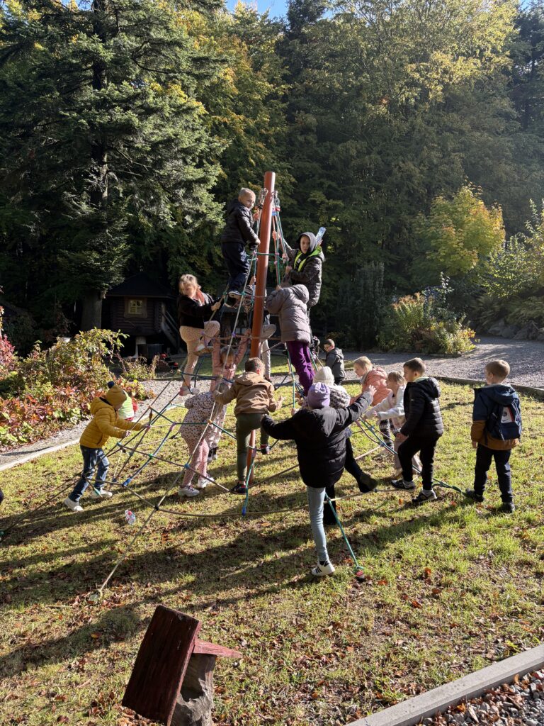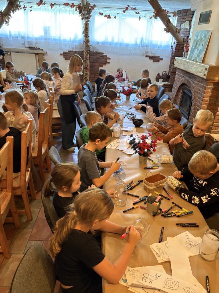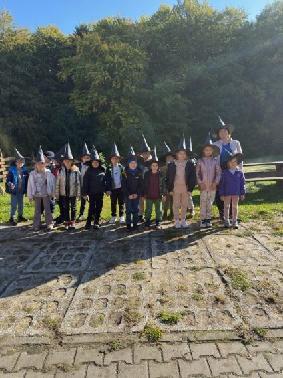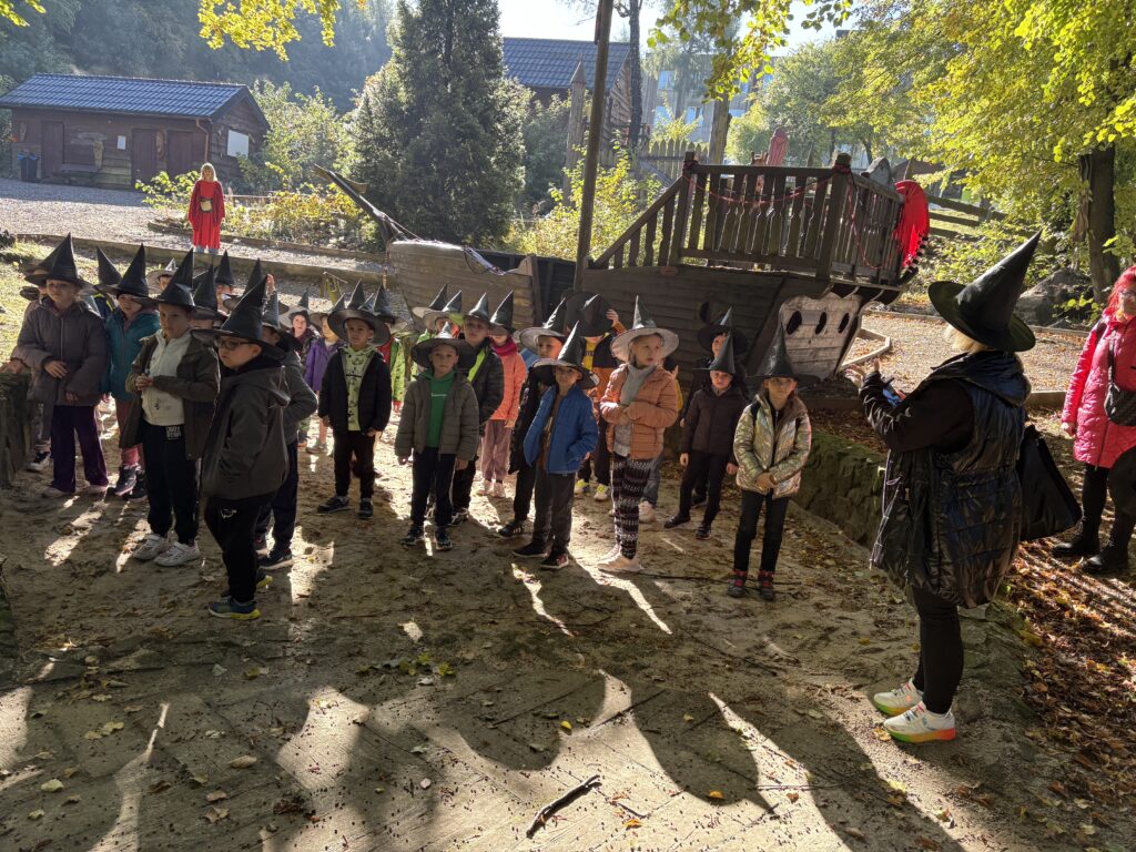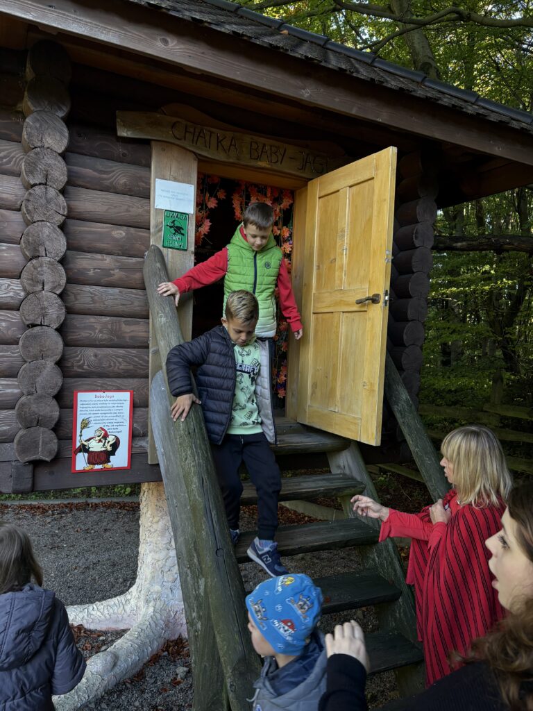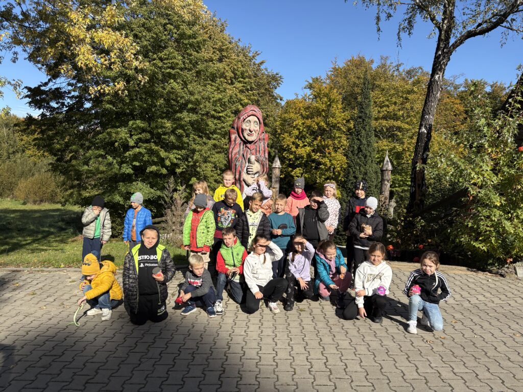 Dnia 8 października 2025r. uczniowie klasy  1b i 2b pod opieką wychowawczyń: p. Katarzyny Lipniak i p. Iwony Ciosek udali się do niezwykłego miejsca, pełnego świętokrzyskich legend. Babyjagowo to miejsce, gdzie można poznać osobiście Babę Jagę i wejść do jej chatki na kurzej stópce. Tam spotkali zbója Madeja, który w odtworzonej zgodnie z legendami jaskini pilnuje swego skarbu.  Odwiedzili również chatkę Jasia i Małgosi, a także  straszny tunel. Skorzystali z placu zabaw oraz wstąpili na wielką łódź Wikingów. Następnie po smacznym poczęstunku był czas na warsztaty plastyczne – malowania na szkle. Każdy uczeń ozdobił samodzielnie słoik i buteleczkę, którą mógł zabrać do domu.