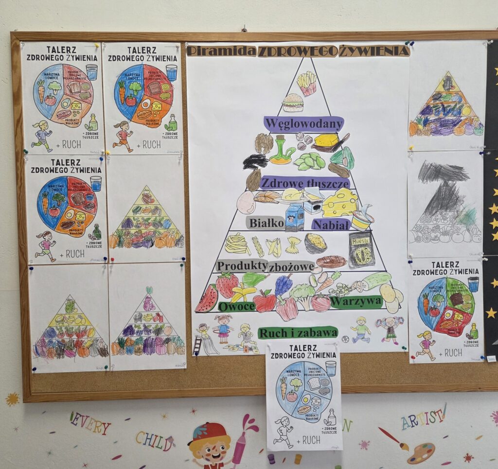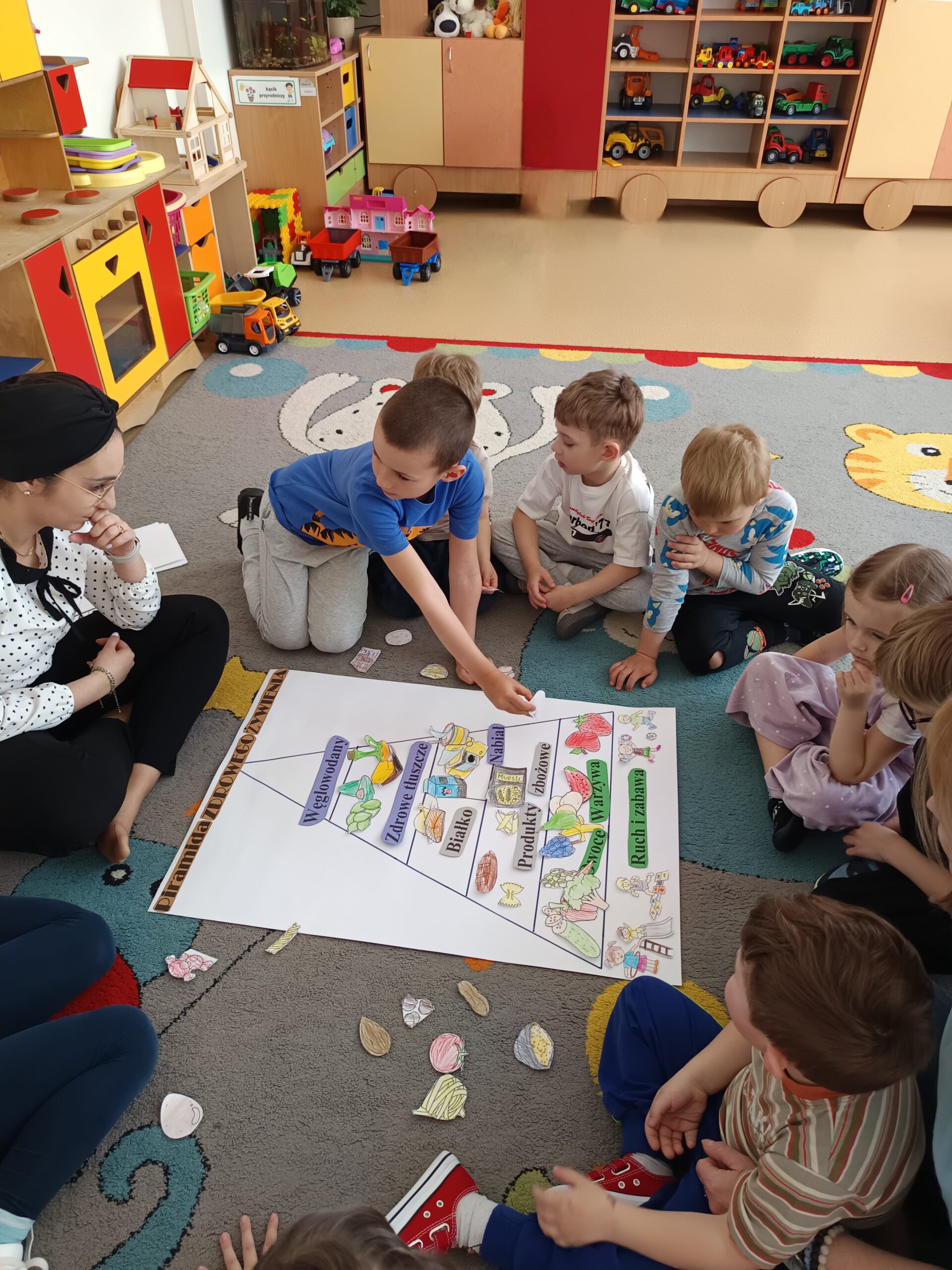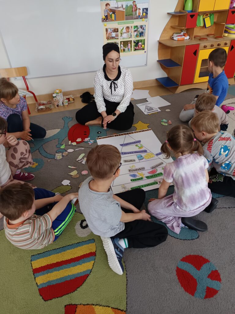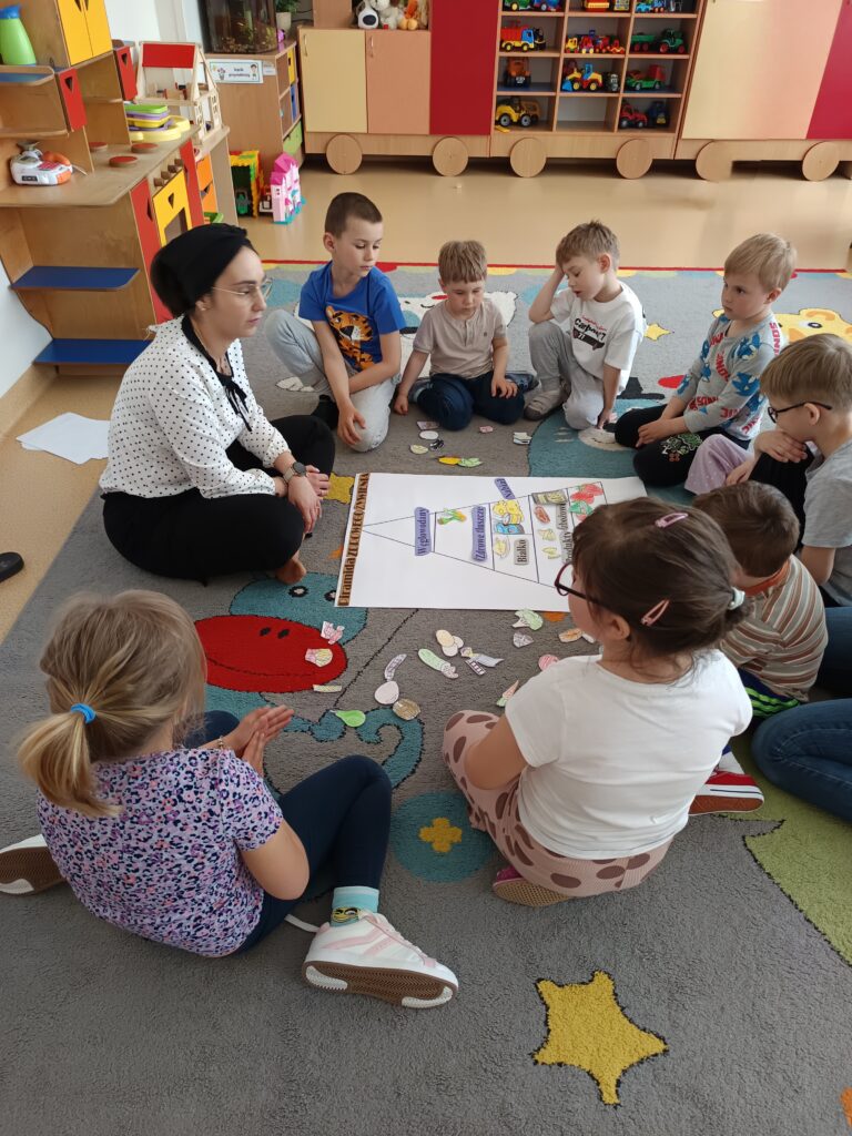 Na zakończenie przedszkolaki wspólnie z p. Małgorzatą Maciszkiewicz stworzyły Piramidę Zdrowia, porządkując wiedzę o zasadach prawidłowego odżywiania oraz kolorowały Talerz Zdrowego Żywienia, utrwalając zdobyte informacje w formie aktywności twórczej.