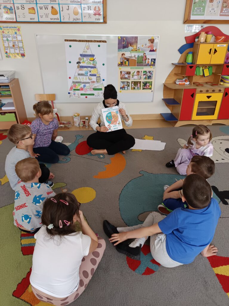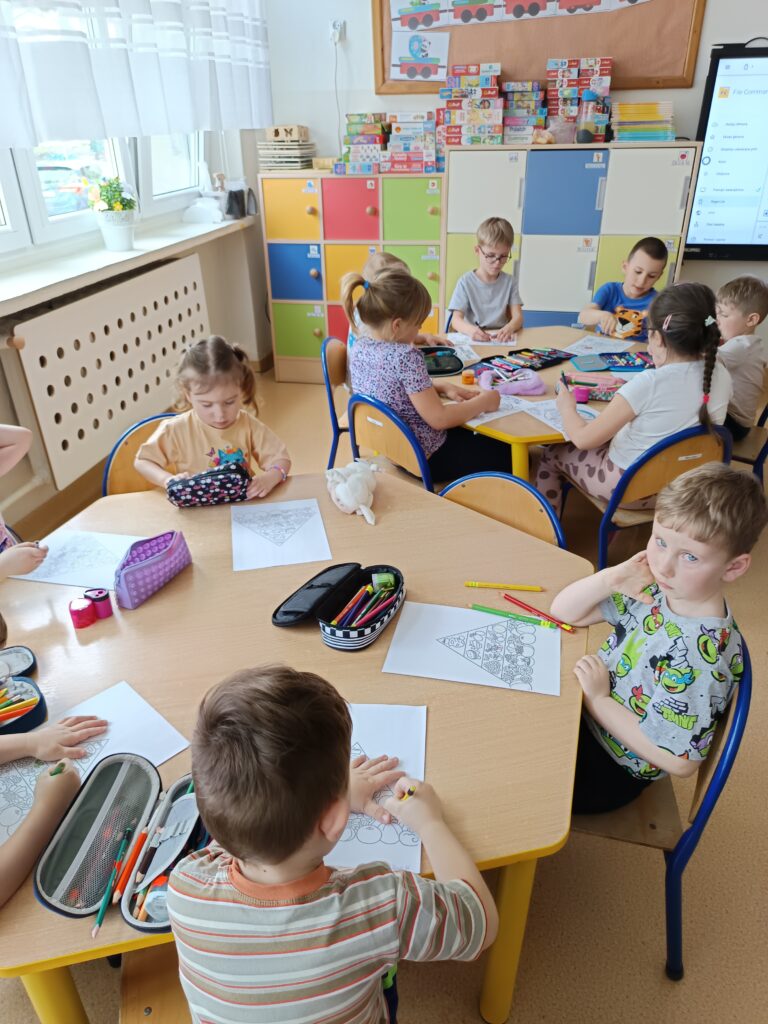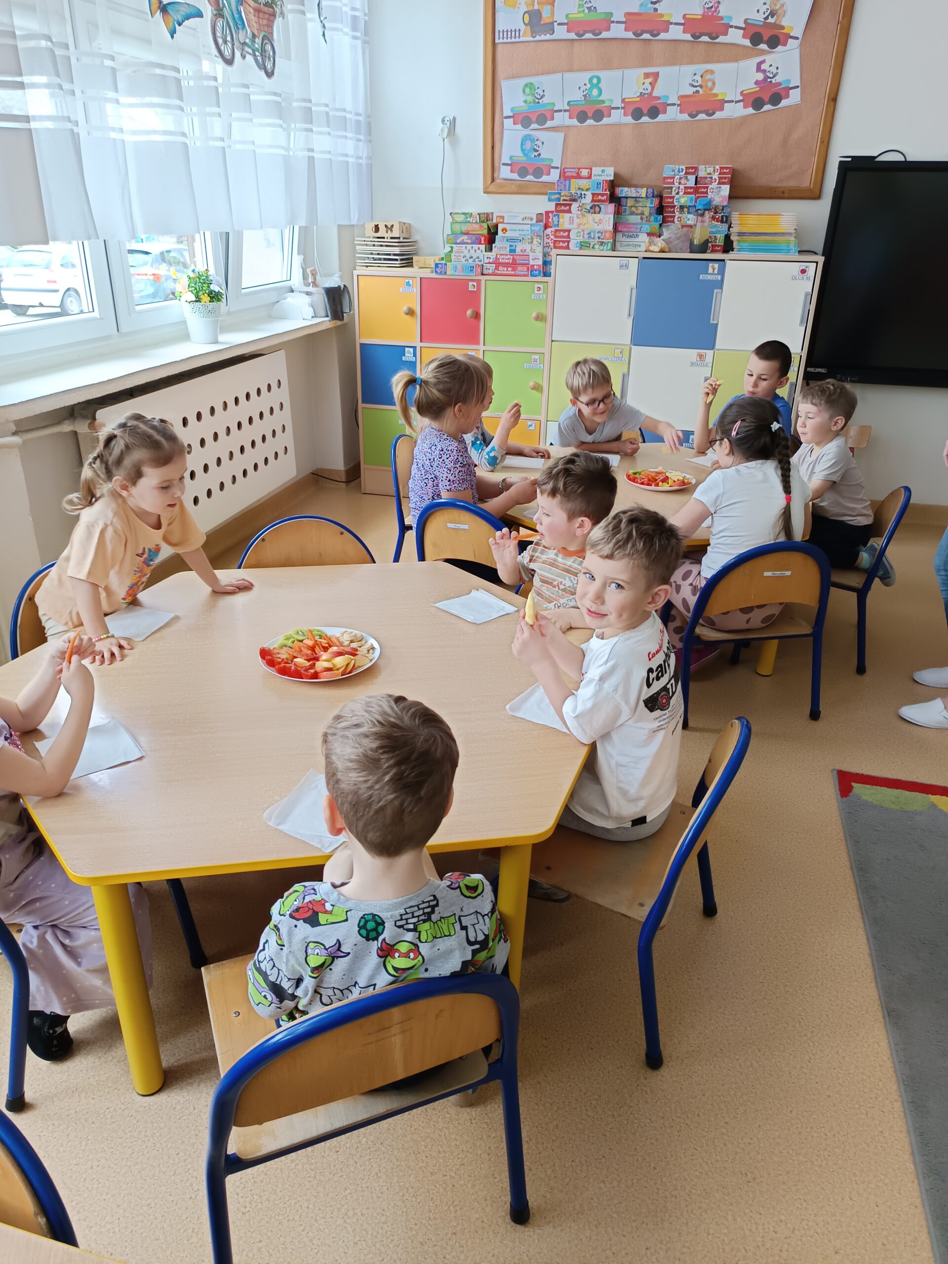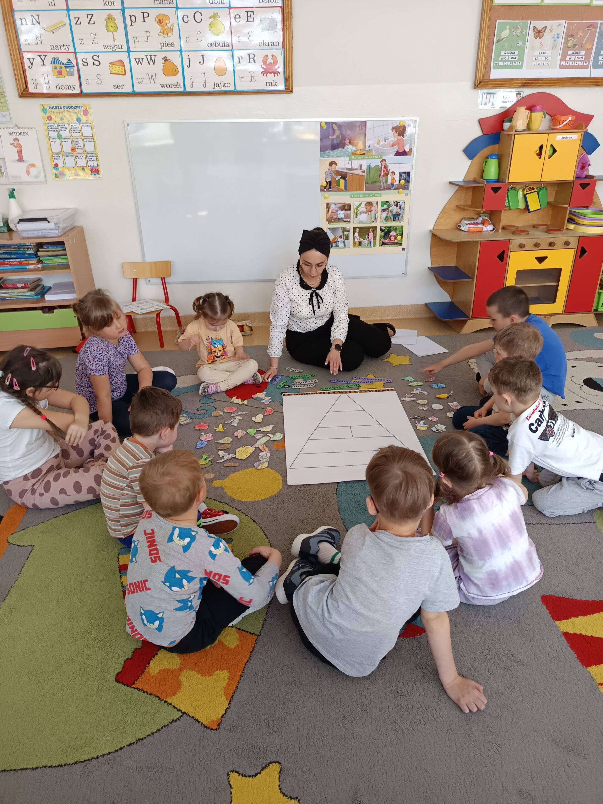 Na zakończenie przedszkolaki wspólnie z p. Małgorzatą Maciszkiewicz stworzyły Piramidę Zdrowia, porządkując wiedzę o zasadach prawidłowego odżywiania oraz kolorowały Talerz Zdrowego Żywienia, utrwalając zdobyte informacje w formie aktywności twórczej.