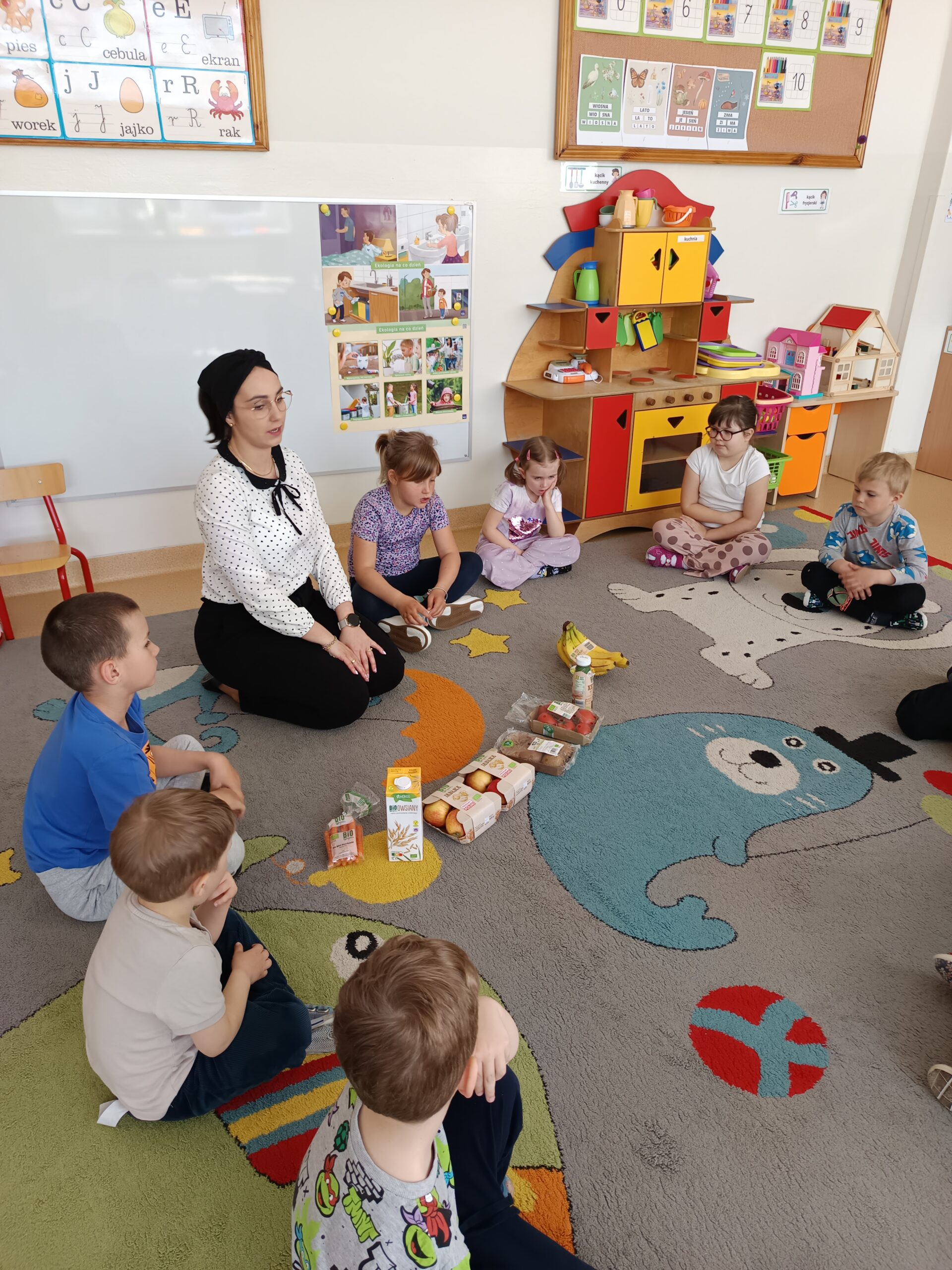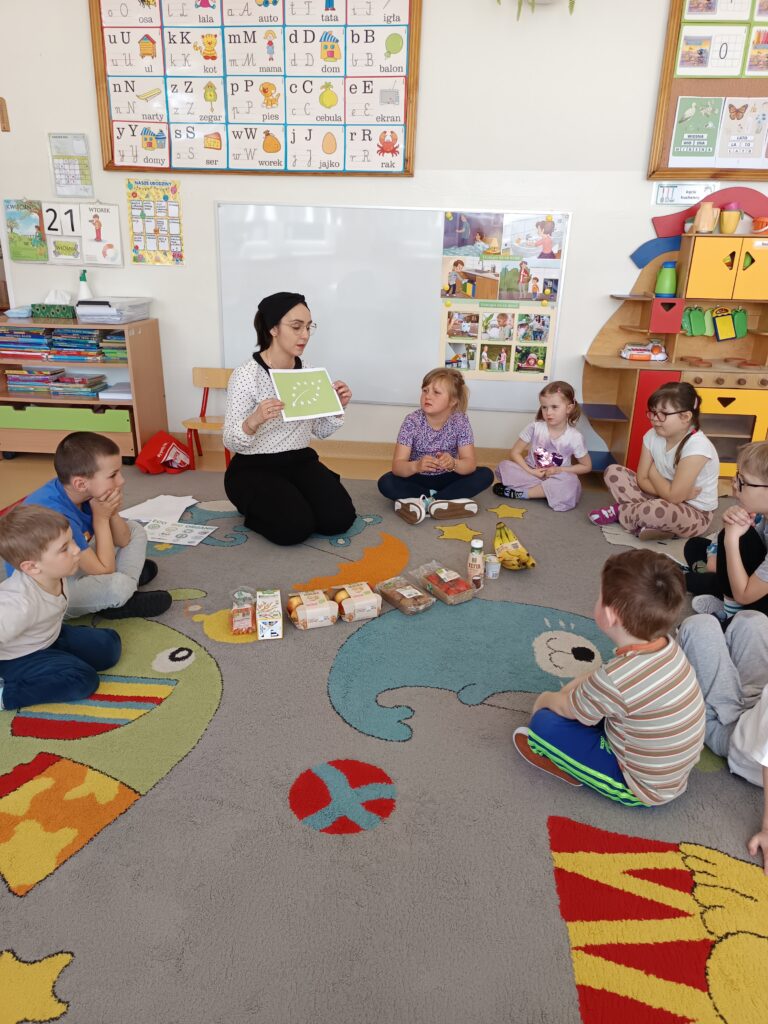 Przedszkolaki poznały wybrane produkty ekologiczne, które mogły dokładnie obejrzeć, porównać je z ich zwykłymi odpowiednikami, a następnie spróbować. Degustacja stała się okazją do rozmowy o tym, czym wyróżniają się produkty ekologiczne, jakie mają oznaczenia i dlaczego ich produkcja wymaga naturalnych metod uprawy oraz troski o środowisko.